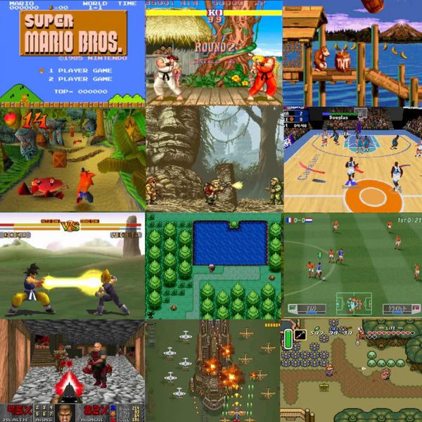 - 35 Consolas: PS1, PS PORTABLE, ARCADE CLASIC, FB ALPHA, NAME, ATARI 2600, 5200, 800, LYNX, CAPCOM 1,2,3, PC ENGINE, SUPER GRAFX, ENTERTRAIMER SYSTEM, ENTERTRAIMER SYSTEM HACKS, GAMEBOY, SUPER FAMICOM, SUPER NINTENDO, GAMEBOY COLOR, GAMEBOY ADVANCE, SEGA GENESIS, SEGA GAME GEAR, SEGA MEGA DRIVE, NEO GEO, NEO GEO POCKET, NEO GEO POCKET COLOR, 3D,